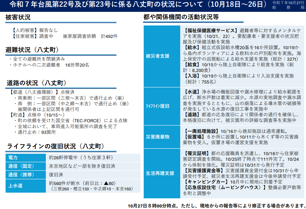 出典:『令和7年台風第22号及び第23号に係る八丈町の状況について(10月18日~26日)』(2025/10/27 東京都)、『東京電力パワーグリッド 停電情報』